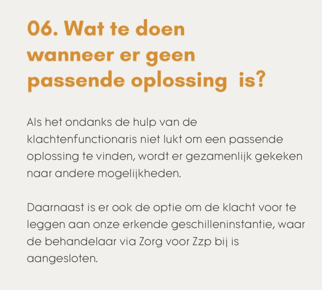 Heb je een klacht dan kun je deze indienen per e-mail naar info@zorgvoorzzp.nl een van de klachtenfunctionarissen nemen zo snel mogelijk contact met je op en gaan er alles aan doen om een passende oplossing te vinden