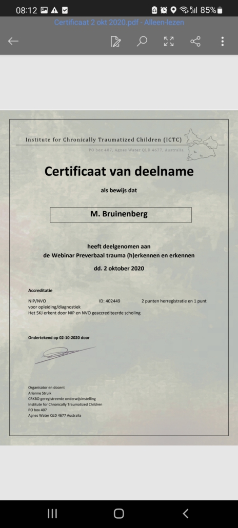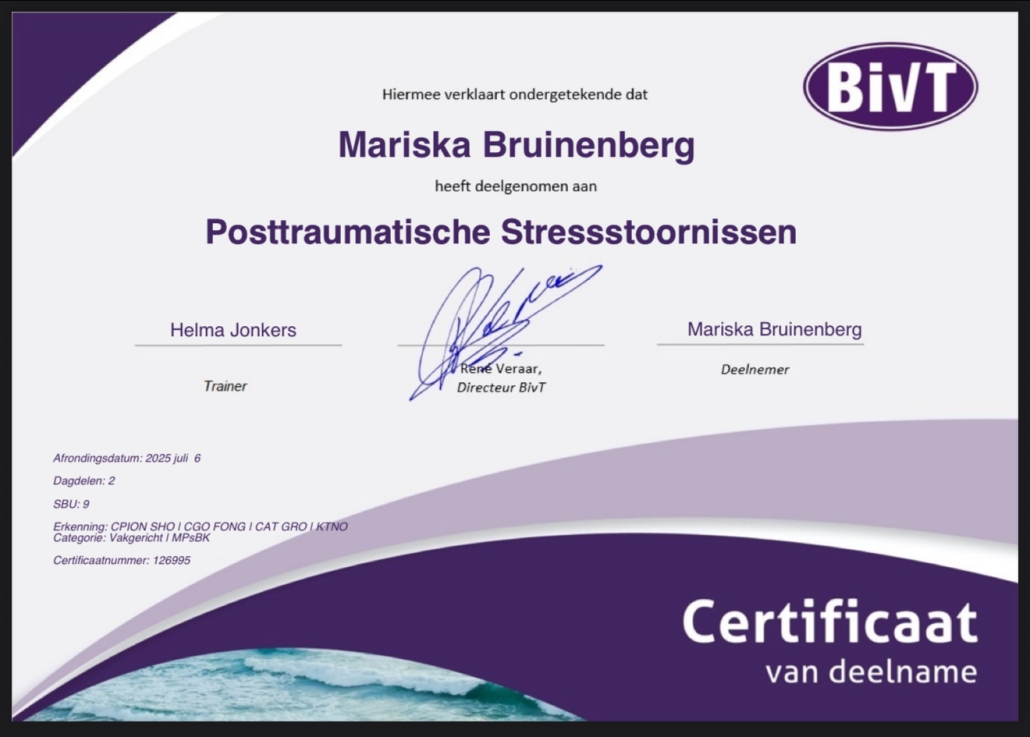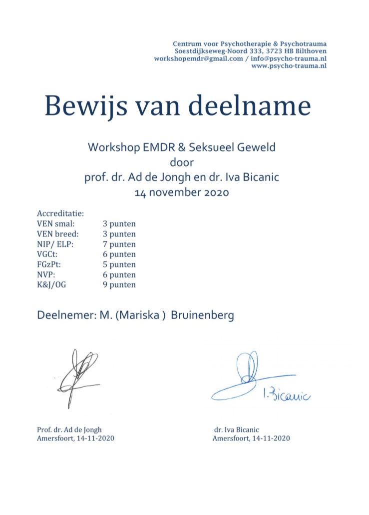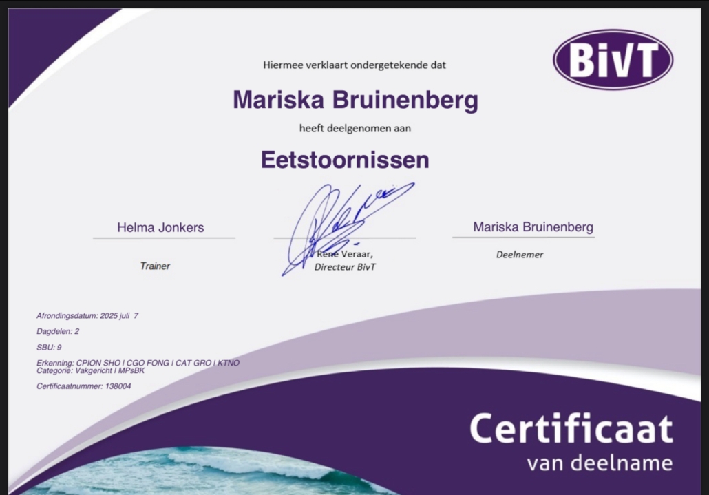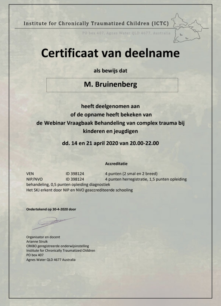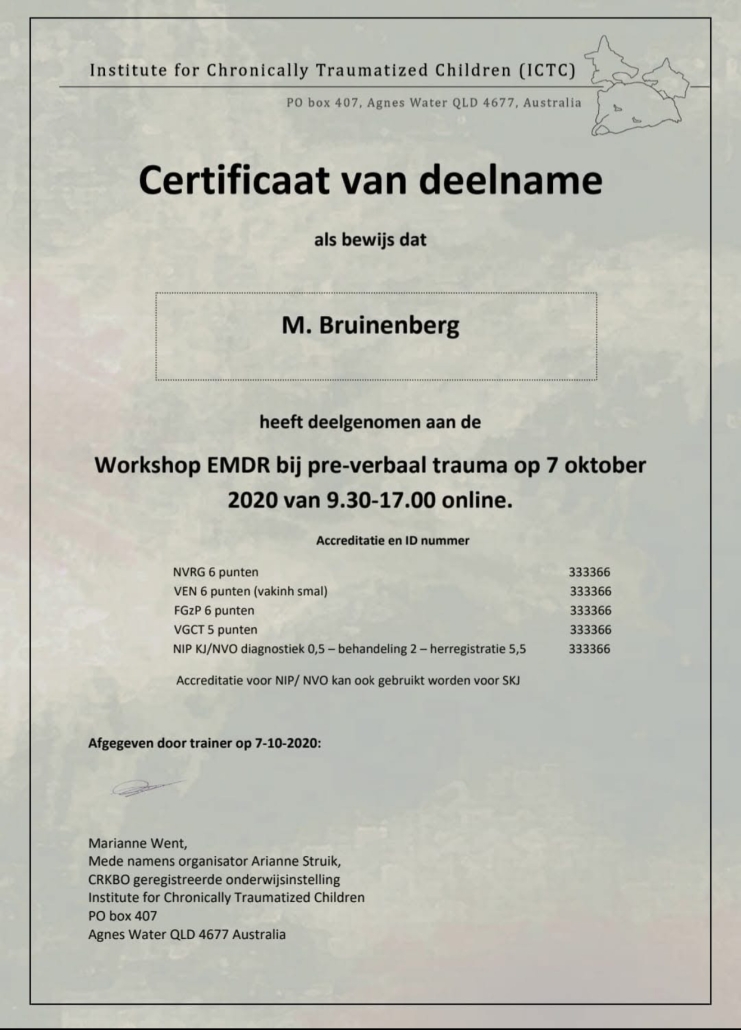 Bij deze een kleine greep uit de map met certificaten en diploma’s van M. Bruinenberg. In onze praktijk kunt u de gehele map vrijblijvend inkijken. Dit is ook door het IGJ gedaan en ook deze hebben bevestigd dat het akkoord is.